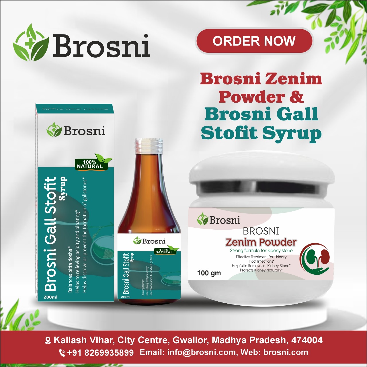 Brosni Gall stofit syrup and Zenim powder are Ayurvedic formulations designed to support the management of gallbladder stones. These products are made from a blend of natural herbs that may help improve gallbladder function, promote bile flow, and gradually dissolve stones.